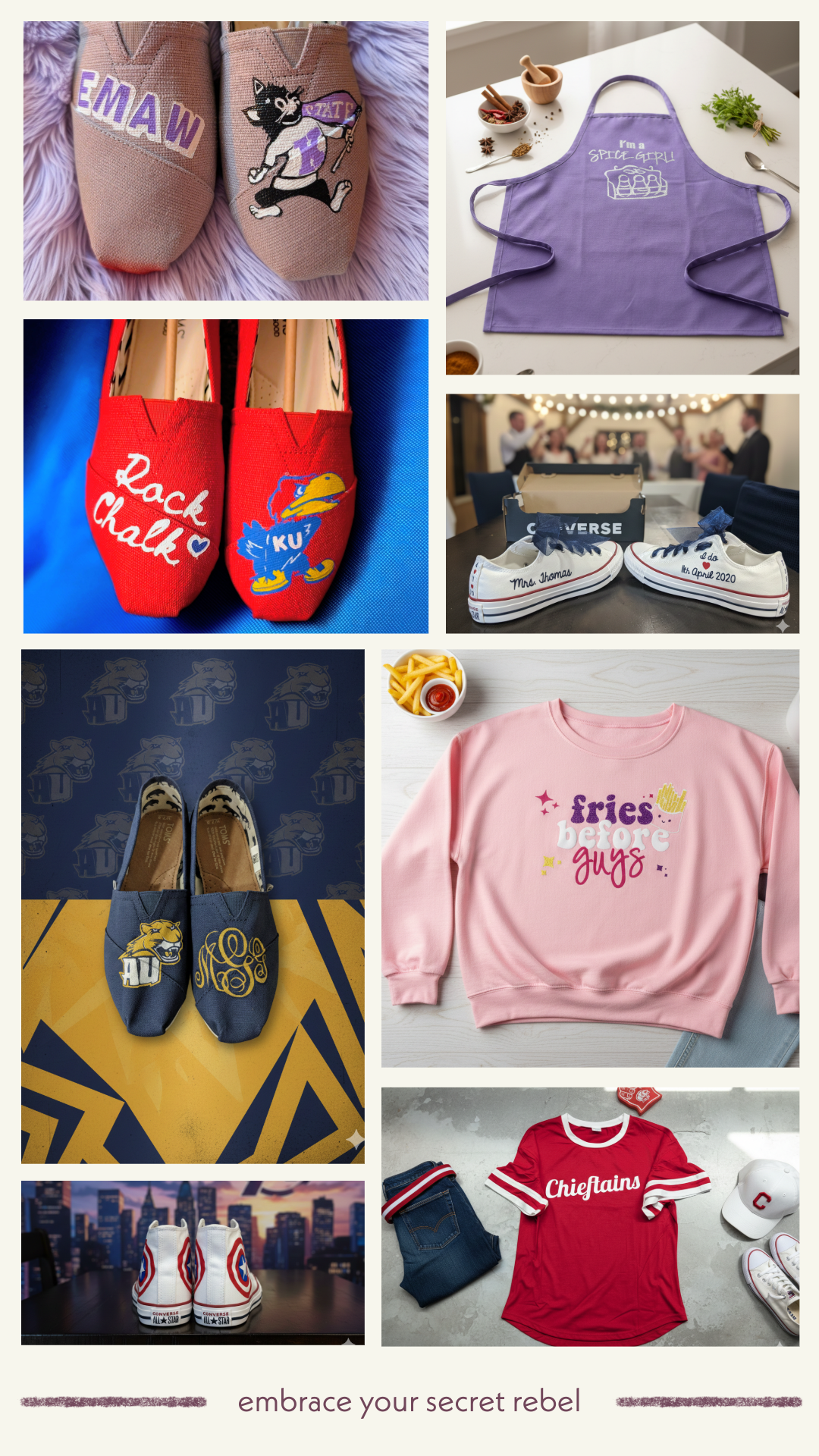 We specialize in high-quality, creative goods including custom-painted footwear, game-day spirit wear, and hilarious decor that adds a spark to any room. With a wide range of t-shirts, sweatshirts, and accessories for all ages, we make it easy to find the perfect gift—or a little treat for yourself. If you don’t see exactly what you’re looking for, just ask! We specialize in custom orders tailored just for you.